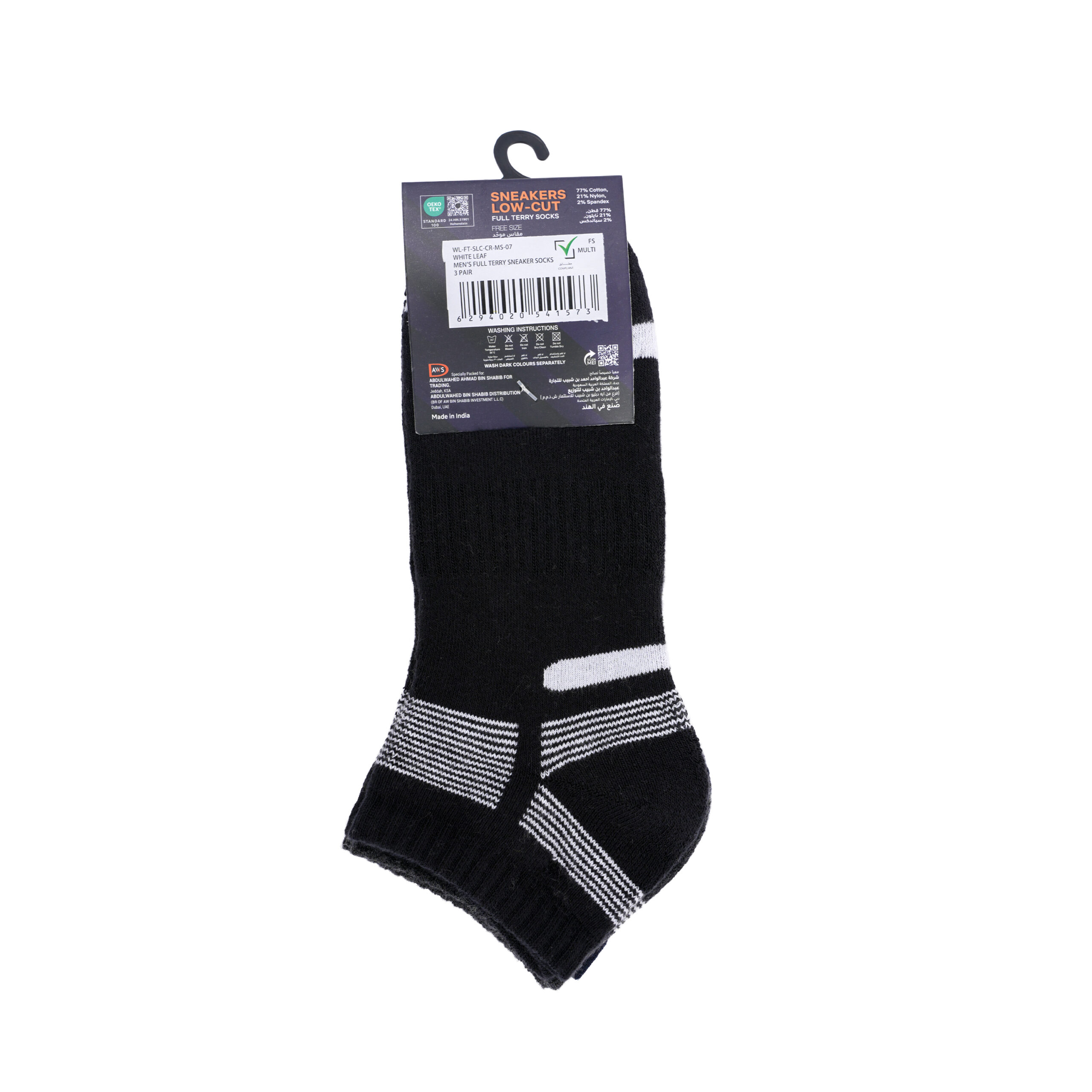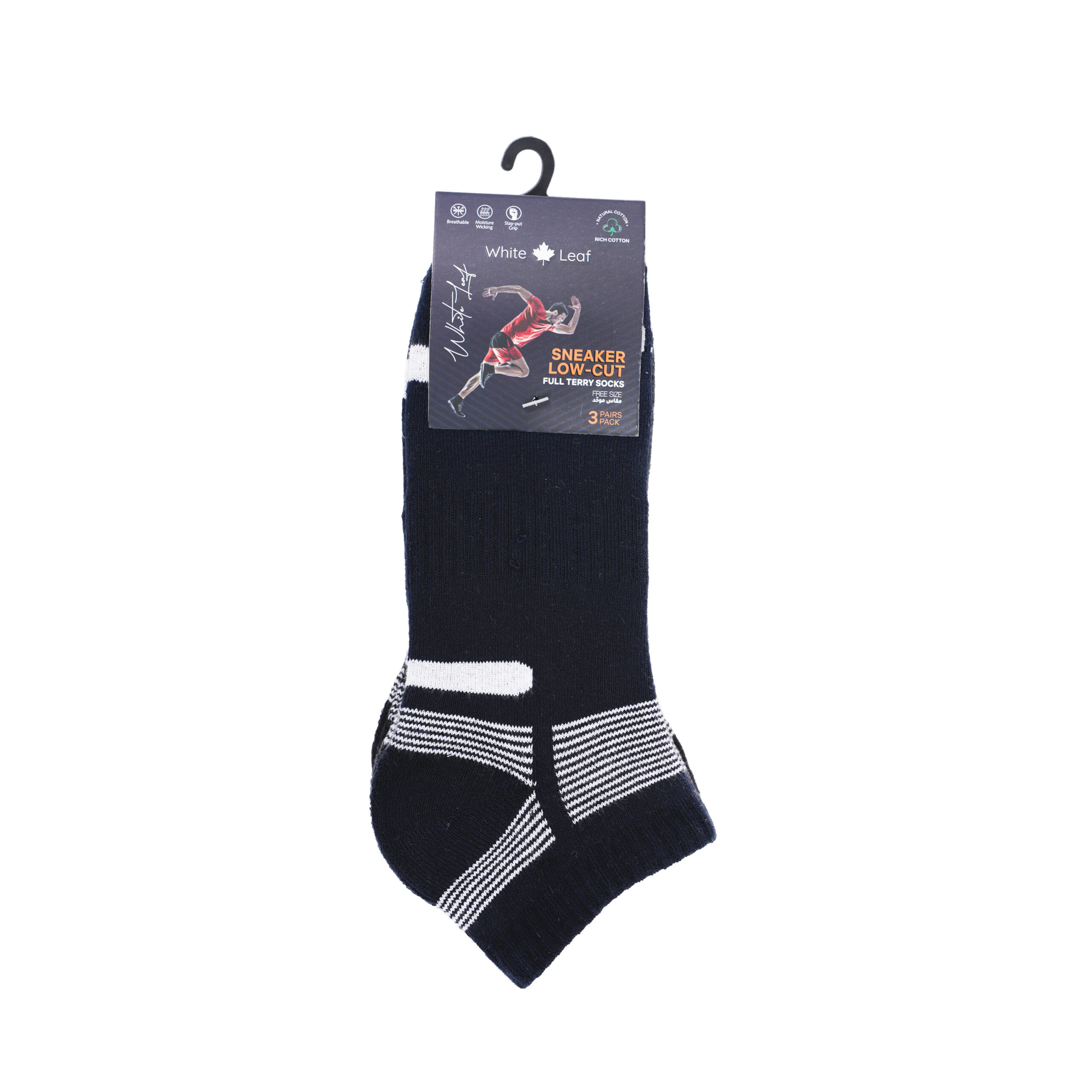 White Leaf Men’s Sneaker Full-Terry Low-Cut Socks (7 cm length) offer exceptional comfort and support. Made from 77% cotton, 21% nylon, and 2% spandex, these socks are soft, breathable, and designed for all-day wear. The full-terry footbed provides extra cushioning for a soft and supportive feel, perfect for active or casual use. Available in black, navy, and charcoal, this set includes three pairs in free size to fit most foot sizes comfortably. These socks are ideal for wearing with sneakers, providing a stylish and comfortable fit for everyday wear.