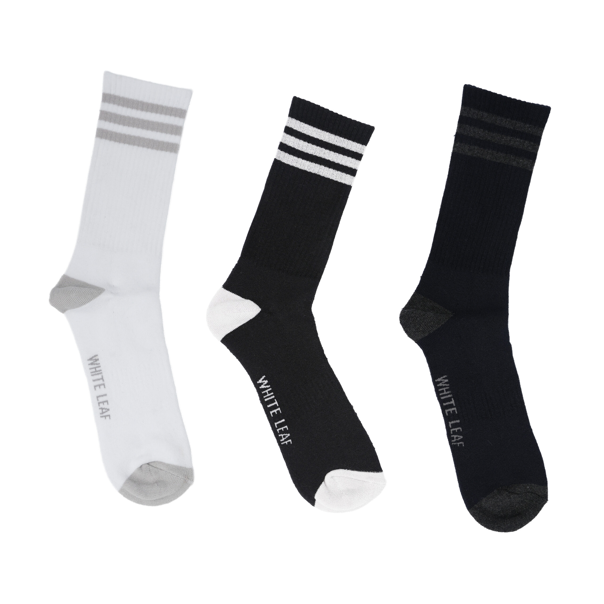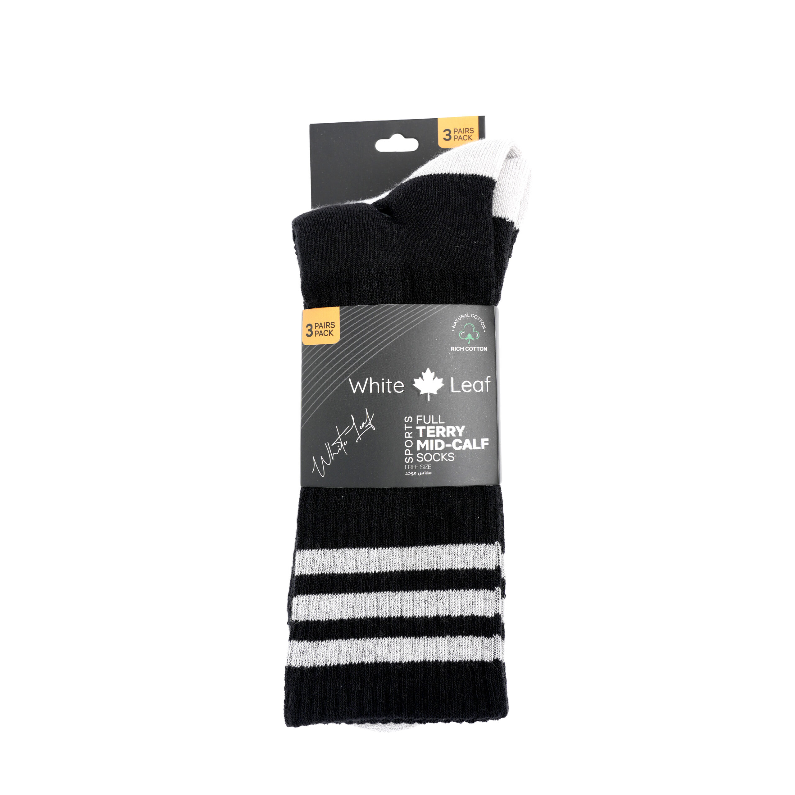White Leaf Men’s Sports Full-Terry Mid Calf Socks (24 cm x 23 cm) provide ultimate comfort and support, making them perfect for active wear. Crafted from a blend of 77% cotton, 21% nylon, and 2% spandex, these socks are soft, breathable, and designed for long-lasting wear. The full-terry footbed ensures superior cushioning for added comfort, making them ideal for sports, casual wear, or extended use. This set includes three pairs in versatile colors—black, grey, and white—and is designed in free size to fit most foot sizes comfortably.